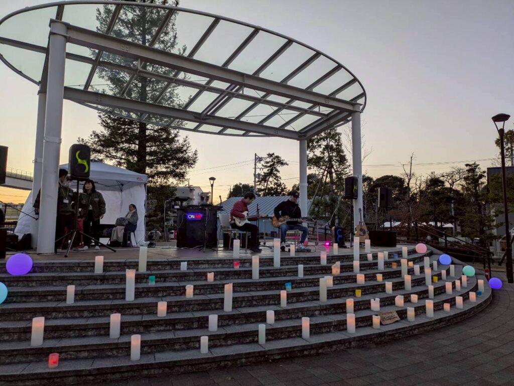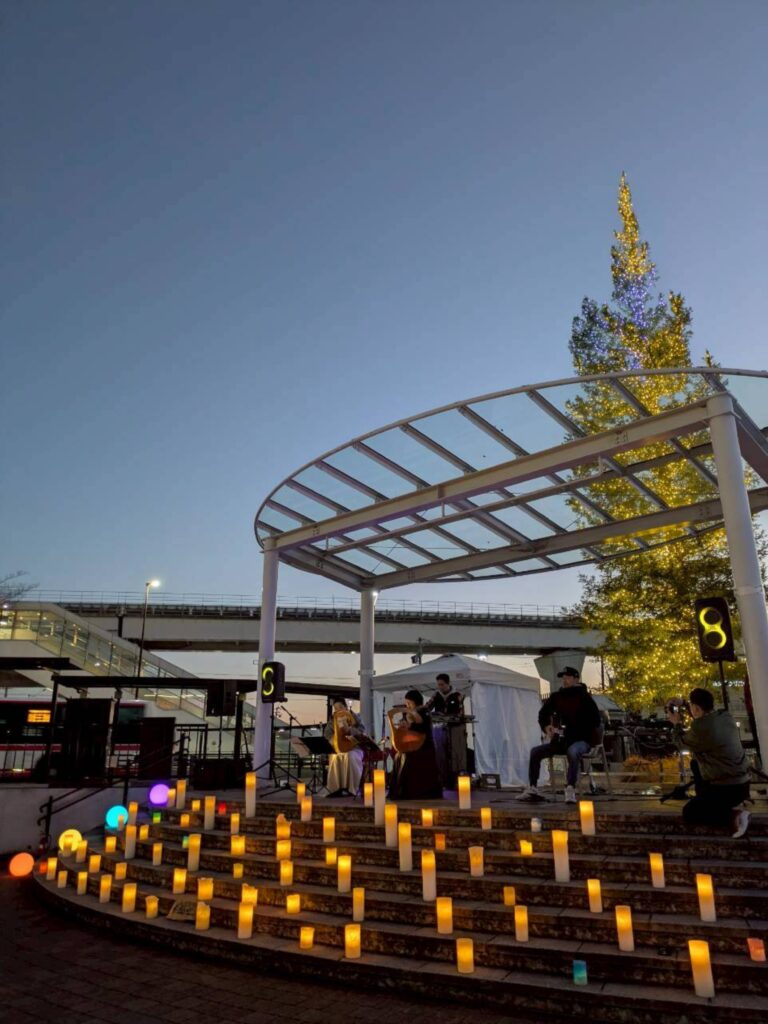 キャンドルに囲まれ、イルミネーションをバックにギターを弾くなんてなかなかできない体験でした。(とても寒かったですが(笑))